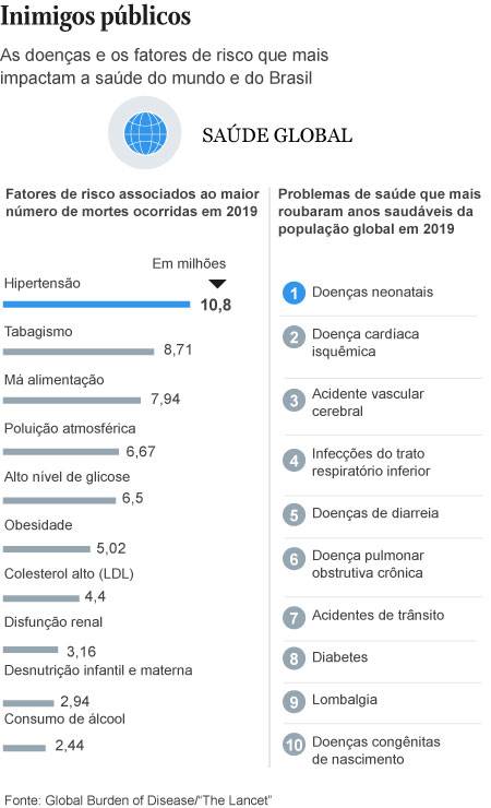 “A Covid-19 é uma emergência de saúde aguda sobre uma emergência de saúde crônica”, afirmou em comunicado Richard Horton, editor-chefe da Lancet, que publica o GBD. “E a cronicidade da crise atual está sendo ignorada a nosso próprio risco futuro. Doenças não transmissíveis tiveram um papel crítico em impulsionar as mais de 1 milhão de mortes causadas pela Covid-19 até agora e continuarão a determinar a forma da saúde em todos os países depois que a pandemia passar.”