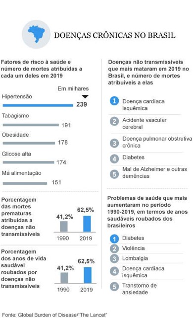 Nesse contexto, as doenças não transmissíveis aumentaram de peso — de 51% para 71% — dentro da perda de vida saudável registrada no Brasil. No cenário global, a interação dessas doenças com a Covid-19 preocupa igualmente.